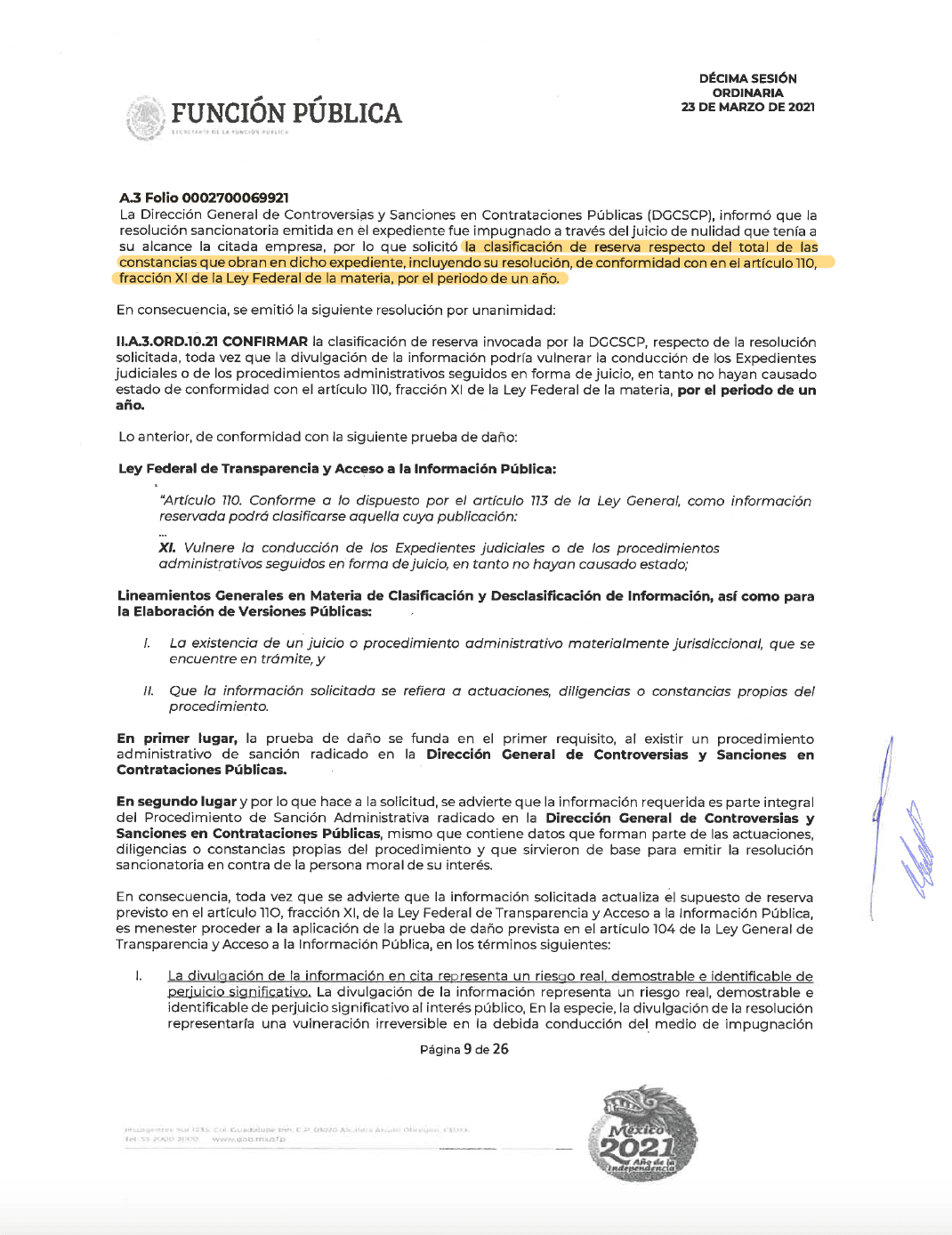 Tras la nueva petición de acceso al expediente, el Comité de Transparencia de la Secretaría Anticorrupción y Buen Gobierno ratificó la reserva de información por tres años más, argumentando que el caso sigue en curso, por lo que publicar el expediente dañaría el debido proceso.