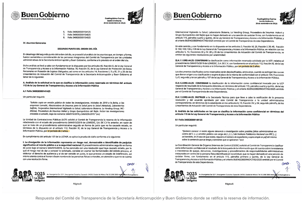 La investigación iniciada desde el año 2019 contra la empresa Lomedic ya había recibido una reserva de información por un año en 2021 y ahora el Comité de Transparencia de la Secretaría Anticorrupción y Buen Gobierno lo extiende por tres años más.