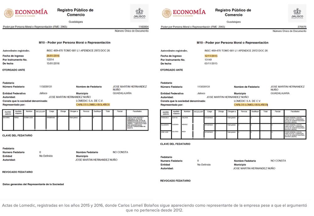 MCCI consultó las asambleas públicas transparentadas por el Registro Público de Comercio y no encontró ninguna acta correspondiente a dicha fecha; sin embargo, el 15 de enero de 2016, cuando ya se habían firmado los contratos en disputa, se registró un acta donde Carlos Lomelí Bolaños seguía apareciendo como representante de Lomedic, lo que contradice su declaración ante el TFJA.