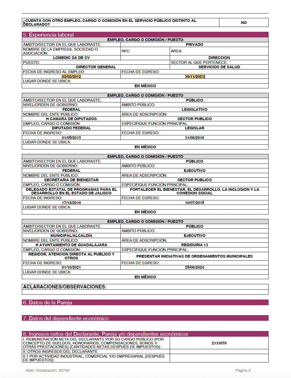 Además, en su propia declaración de situación patrimonial, presentada en mayo de 2025 ante la Cámara de Senadores, Carlos Lomelí Bolaños declaró que mantuvo el puesto de Director General de Lomedic desde el 2 de febrero de 2012 hasta el 30 de noviembre de 2021, lo que contradice nuevamente el argumento por el que el Tribunal de Justicia Administrativa habría librado a Lomedic de una de sus inhabilitaciones.