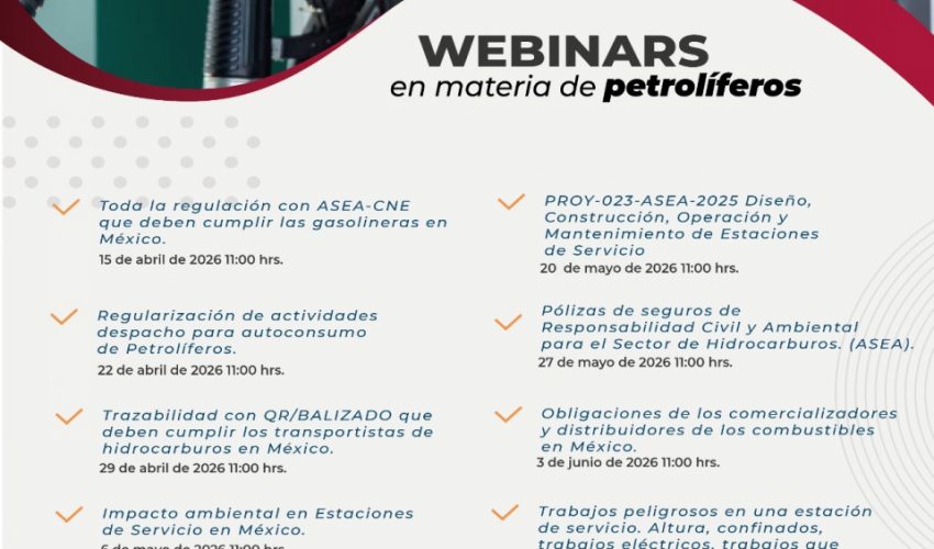 Indicó que las sesiones se llevarán a cabo todos los miércoles, hasta el 17 de junio, a las 11:00 horas (tiempo del centro), en modalidad virtual. Durante estos encuentros se abordarán temas como las regulaciones aplicables a estaciones de servicio y autoconsumo, el cumplimiento de controles volumétricos de combustibles, la contratación de pólizas de responsabilidad civil y ambiental, así como la obligación del balizado en unidades de transporte de combustibles, entre otros aspectos relevantes.