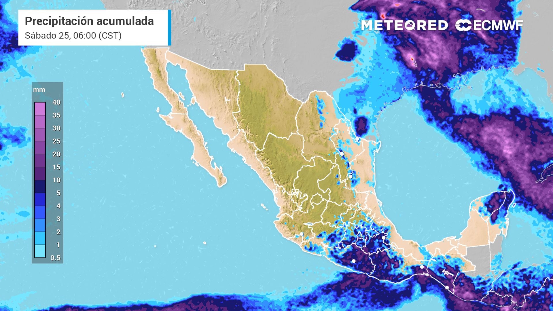 Lluvias y riesgos en la Mesa Central y el SurLa formación de vaguadas en el interior del país, reforzadas por la entrada de humedad de ambos litorales, originarán lluvias fuertes de 25 a 50 mm en Puebla, Guerrero, Oaxaca y Chiapas.