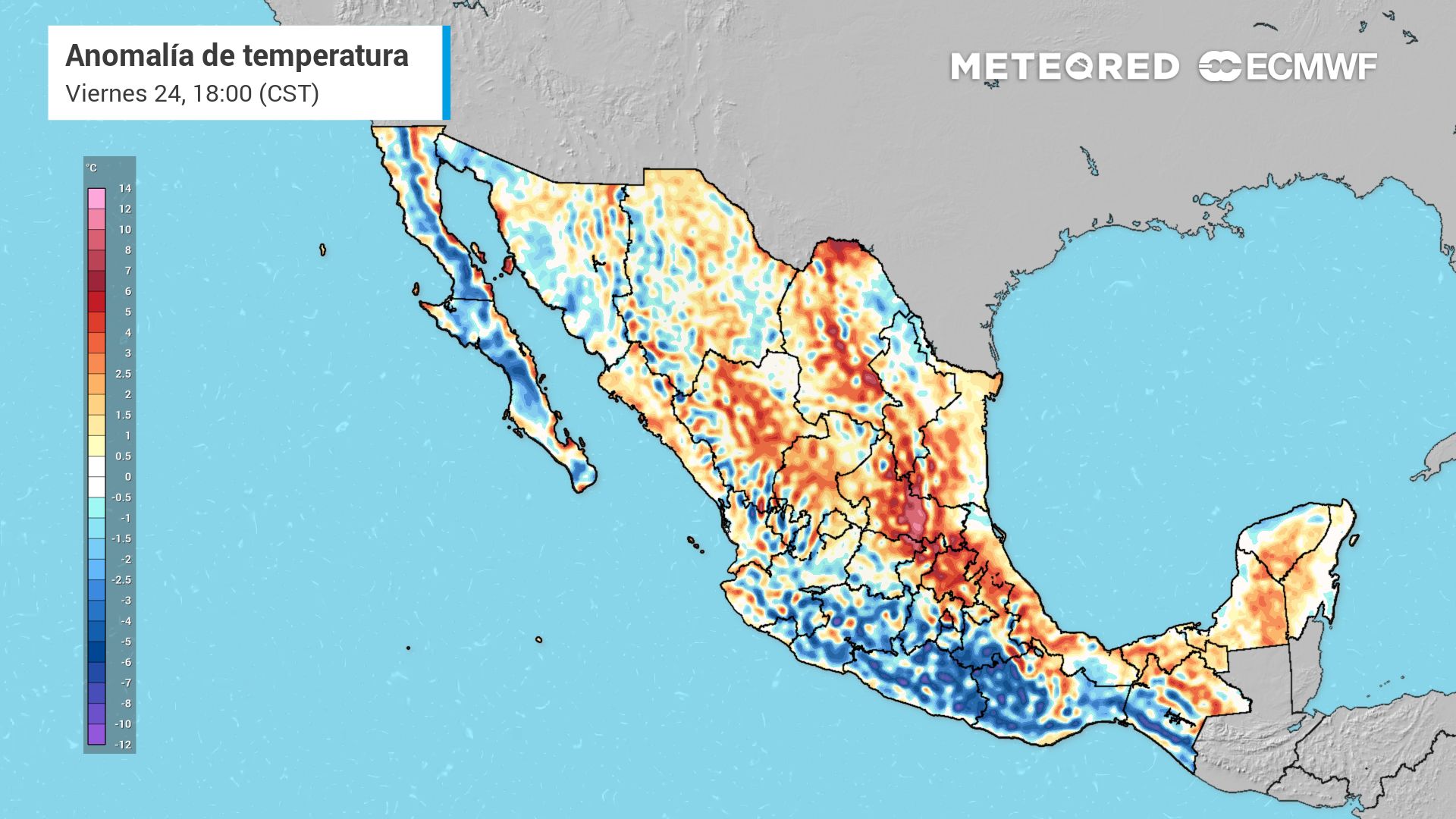 Artículo relacionadoOlas de calor y su incremento en el medio ambienteMientras los valores de temperaturas máximas serán de 35 a 40 °C en Sonora, Nayarit, Jalisco, Colima, Chihuahua, Coahuila, Nuevo León, Tamaulipas, Zacatecas, Guanajuato, Querétaro, Hidalgo, Puebla, Veracruz, Tabasco, Chiapas, Campeche y Yucatán, y máximas de 30 a 35 °C en Baja California, Baja California Sur, Aguascalientes y Quintana Roo.