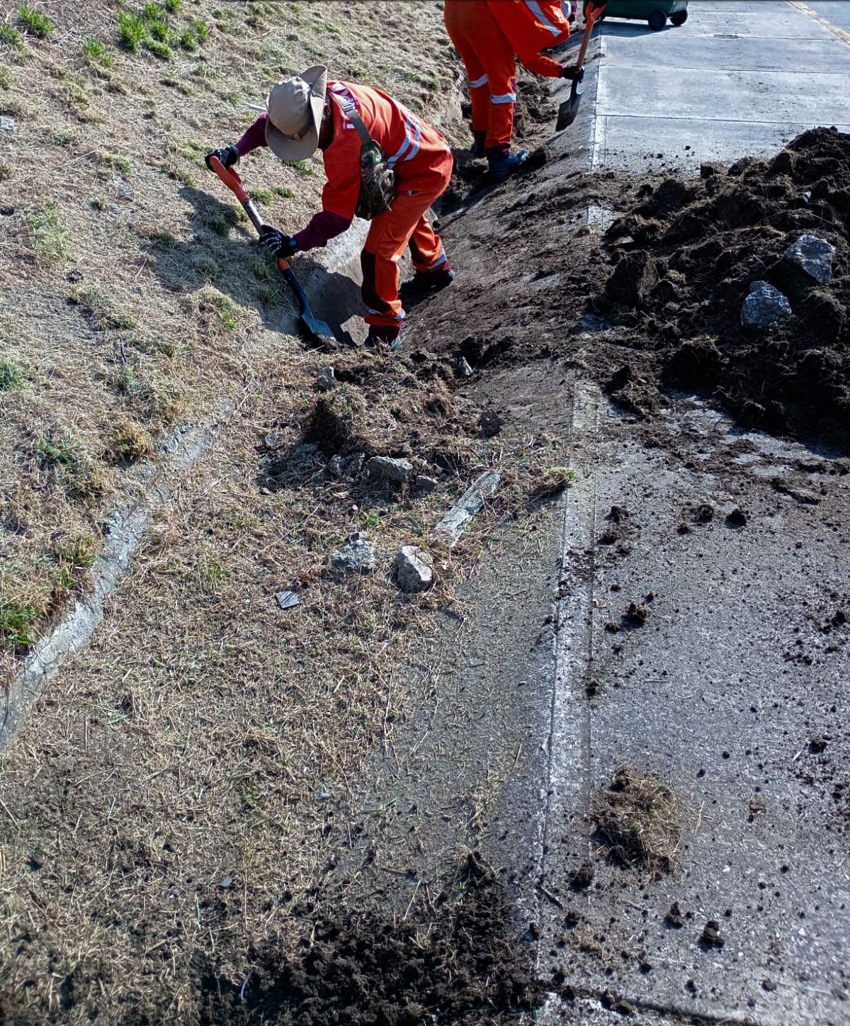 Durante la intervención, cuadrillas del OOSL retiraron hierba, tierra acumulada y residuos sólidos que obstruían el paso del agua en las cunetas, lo que permitirá restablecer su capacidad de conducción y mejorar el desalojo de escurrimientos pluviales.