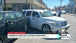 Ciudad Juárez, Chih.- Un fuerte accidente vial se registró este día en las inmediaciones de la zona centro, específicamente en el cruce de las calles Tlaxcala y Xochimilco de la colonia Cuauhtémoc, donde tres vehículos resultaron involucrados en una colisión que movilizó a las autoridades locales.