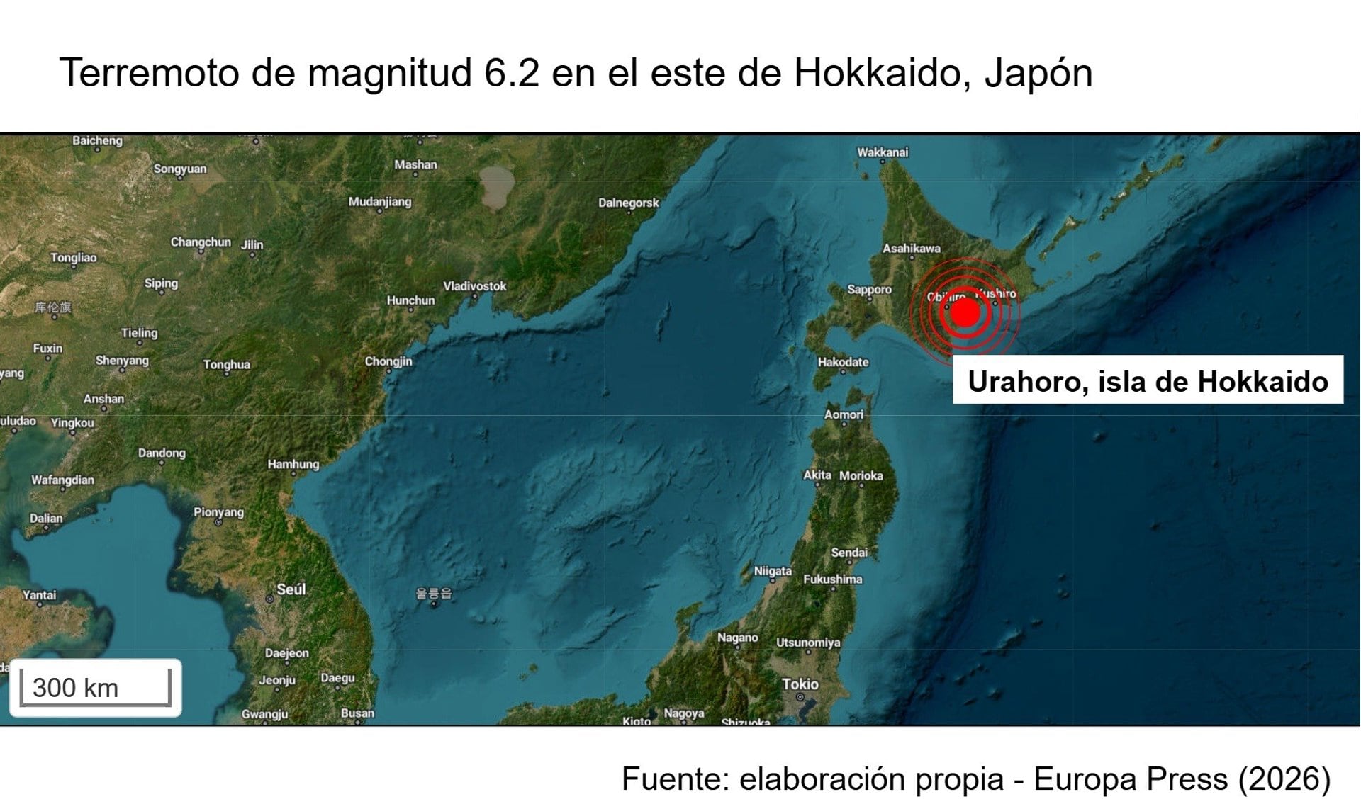 El temblor ha tenido lugar a las 5.23 horas y a una profundidad de 83 kilómetros en la parte sur del distrito de Tokachi, según ha indicado la Agencia Meteorológica de Japón (JMA), que le ha atribuido una intensidad de 5+ según su escala --que describe el grado de agitación en un punto de la superficie terrestre, con un máximo de 7-- en la ciudad de Urahoro, a escasos kilómetros de la costa oriental de Hokkaido.