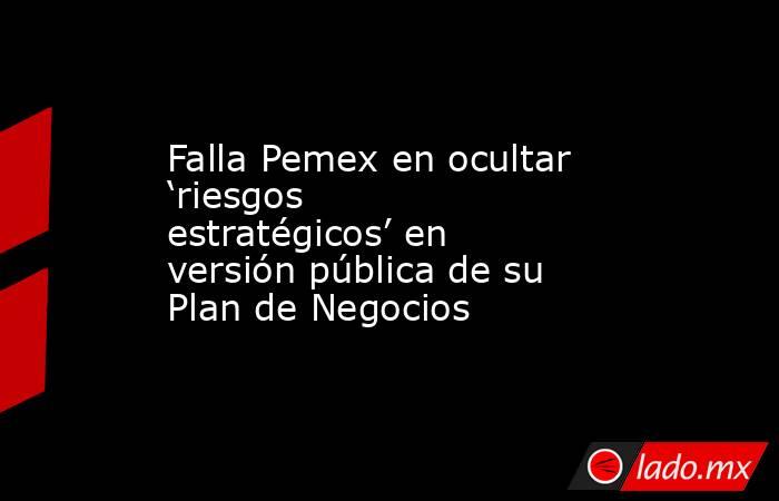 - En la versión pública de su Plan de Negocios dado a conocer ayer, Pemex “ocultó” riesgos estratégicos de sus proyectos y las preocupaciones sobre corrupción, robo de hidrocarburos, retraso en obras, fallas de contratistas y escenarios en caso de que las calificadoras internacionales le bajen la calificación crediticia.