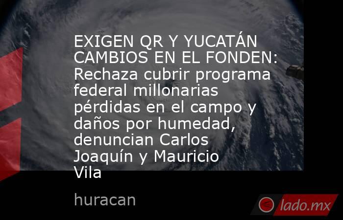 - Los gobernadores de Quintana Roo y Yucatán, Carlos Joaquín González y Mauricio Vila Dosal, anunciaron que unirán fuerzas para abogar para que el Fonden cubra las millonarias pérdidas que sufrió el campo, así como diversos daños en casas y vialidades, producto de la tormenta “Cristóbal”, además de pronunciarse por cambiar las reglas operativas de este programa federal.