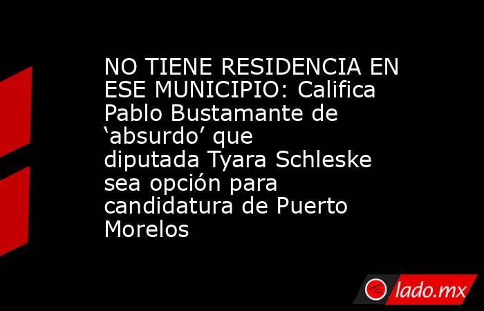 - La especulación que la diputada local Tyara Schleske de Ariño fuera nombrada candidata del Partido Verde para la presidencia municipal de Puerto Morelos es un “absurdo”, afirmó hoy el dirigente estatal de esta fuerza política, Pablo Bustamante Beltrán, quien recordó que la legisladora no tiene residencia en ese municipio.