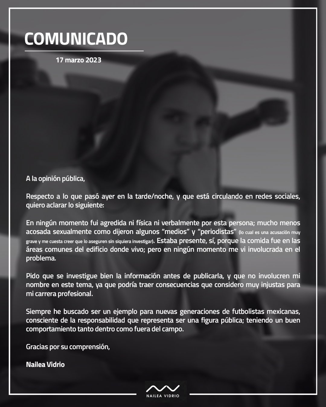“En ningún momento fui agredida ni física, ni verbalmente por este persona; mucho menos acosada sexualmente como dijeron algunos “medios” y “periodistas”. Estaba presente, sí. La comida fue en las áreas comunes del edificio donde vivo, pero en ningún momento me vi involucrada en el problema“, explicó Vidrio en un comunicado.