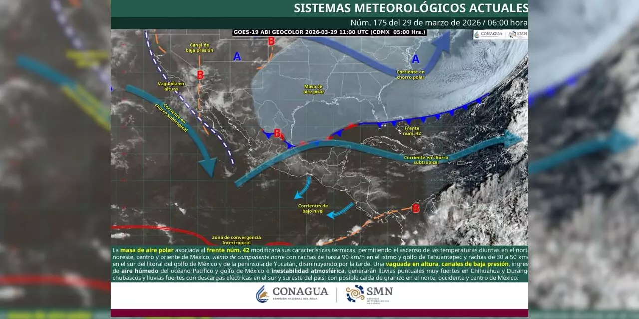 **Lluvias intensas y granizo en Chihuahua y Durango por el Frente Frío 42. Precauciones recomendadas para la noche.** **Frente frío 42:** Bajas temperaturas en México, vientos y descenso térmico en Oaxaca. **Inglés:** * Severe rain and hail expected in Chihuahua and Durango by Front Cold 42. Precautions recommended for the night.