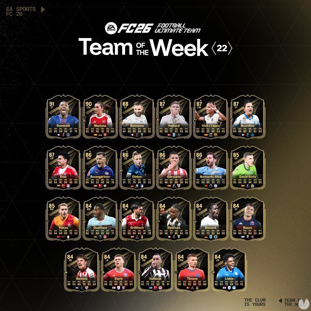 EA Sports ya ha lanzado el TOTW 22 del Ultimate Team con jugadores destacados como Dembélé, Mariona y Benzema. Estas cartas especiales estarán disponibles hasta el 18 de febrero.EA Sports FC 26, el popular título de Deportes y Fútbol, ya tiene un nuevo Team of the Week disponible para España y todo el mundo. La modalidad del Ultimate Team del