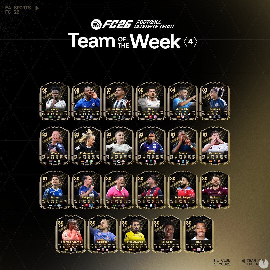 EA Sports ya ha lanzado el TOTW 4 del Ultimate Team con jugadores destacados como Vini Jr, Caicedo y Bruno Guimarães. Estas cartas especiales estarán disponibles hasta el 15 de octubre de 2025.EA Sports FC 26, el popular título de Deportes y Fútbol, ya tiene un nuevo Team of the Week disponible para España y todo el mundo. La modalidad del Ult
