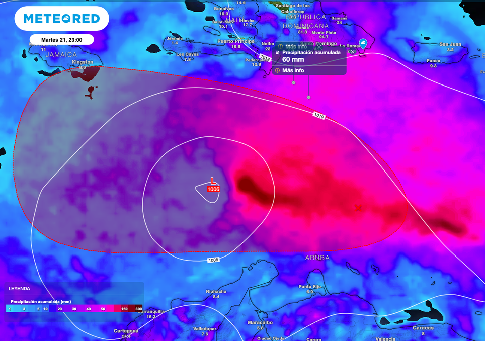 Nubosidad proveniente del Invest 98L que esta adquiriendo más fuerza en interacción con otros sistemas, favorecen la presencia de aguaceros con acumulados de entre 50 a 80 mm en las Antillas menores y mayores.El Invest 98L, favorece con lluvias con acumulados de 30 a 80 mm en las Antillas.La que podría ser la decimotercera tormenta tropical de l