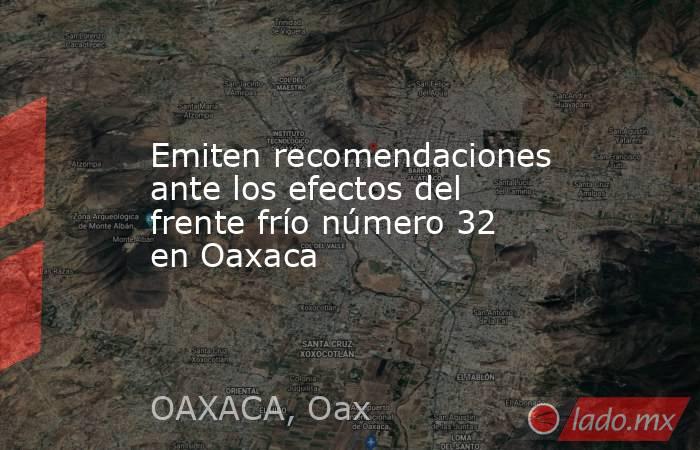 Redacción OAXACA, Oax. La Coordinación Estatal de Protección Civil y Gestión de Riesgos (CEPCyGR) emitió una serie de recomendaciones ante los efectos del frente frío número 32 en territorio oaxaqueño. Derivado del desplazamiento del frente frío número 32 sobre el noroeste del Golfo de México, durante el fin de semana, se presentarán ll