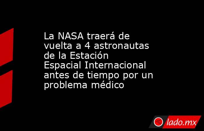 Washington, Estados Unidos.- Un equipo de la NASA en la Estación Espacial Internacional (EEI) regresará a la Tierra antes de lo planeado por un problema médico, dijo el jueves el administrador de la NASA, Jared Isaacman. La agencia no dio detalles de la situación médica, pero sí dijo que el astronauta afectado está estable. También …E