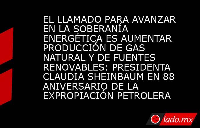 EL LLAMADO PARA AVANZAR EN LA SOBERANÍA ENERGÉTICA ES AUMENTAR PRODUCCIÓN DE GAS NATURAL Y DE FUENTES RENOVABLES: PRESIDENTA CLAUDIA SHEINBAUM EN 88 ANIVERSARIO DE LA EXPROPIACIÓN PETROLERA* * Resaltó que su Gobierno continuará el fortalecimiento de Pemex y de CFE como empresas públicas del Estado y se mantendrá...
