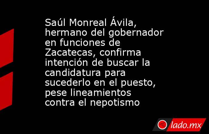 CIUDAD DE MÉXICO (EL UNIVERSAL).- El senador de Morena, Saúl Monreal Ávila, anunció ante cientos de simpatizantes que buscará la candidatura al gobierno de Zacatecas, pese a que su partido prohíbe el “nepotismo electoral”. Al encabezar una asamblea estatal para definir la ruta para lograr la gubernatura, el legislador, hermano del