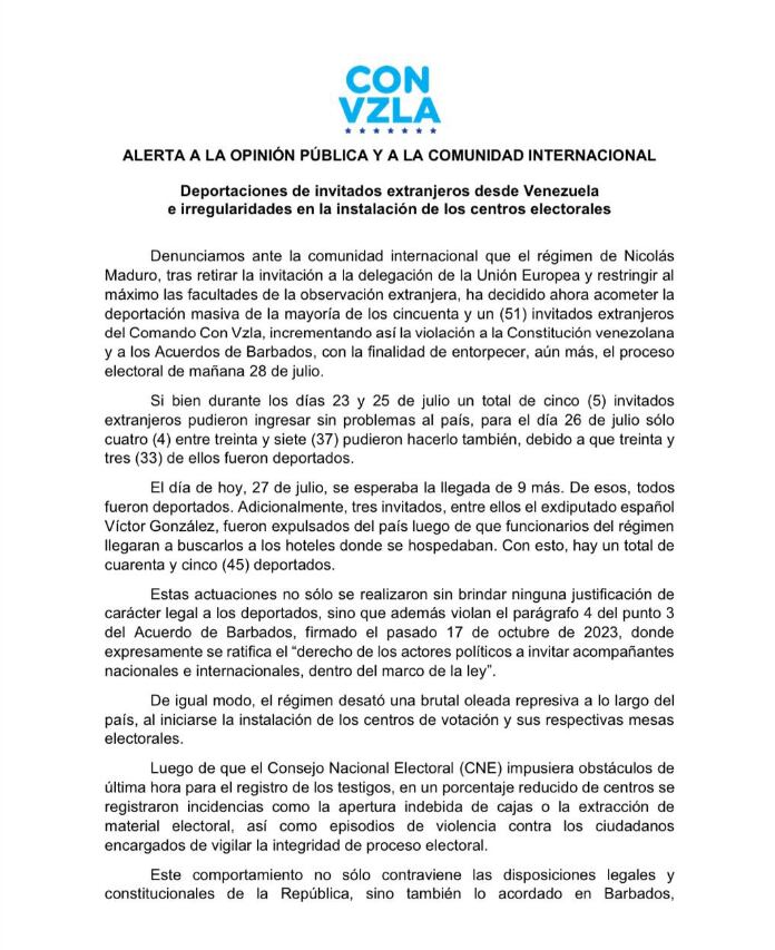 A través de un comunicado difundido en redes sociales, la organización denunció ante la comunidad internacional que “el régimen de Nicolás Maduro, tras retirar la invitación a la delegación de la Unión Europea y restringir al máximo las facultades de la observación extranjera,” ha decidido ahora acometer la deportación masiva de la mayoría de los cincuenta y un (51) invitados extranjeros del Comando Con Vzla, incrementando así la violación a la Constitución venezolana y a los Acuerdos de Barbados”