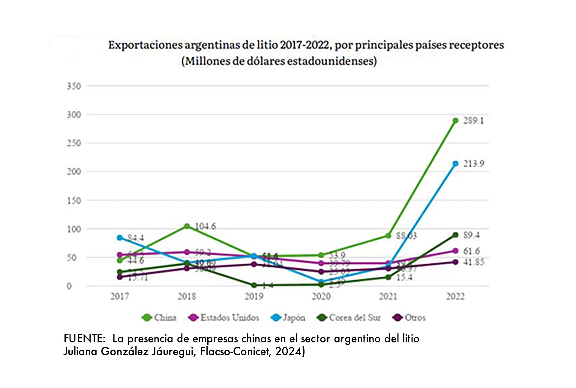 Un estudio de 2024 de Juliana González Jáuregui, investigadora de la Unsam, sobre la “presencia china en el mercado argentino del litio” identificó 14 proyectos litíferos en que el inversor principal o alguno de los asociados es una firma china.